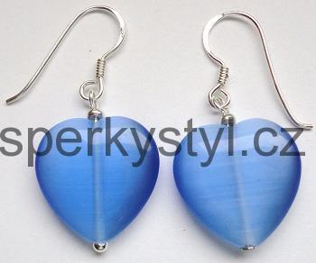 Elegantní stříbrné náušnice se syntetickým minerálem ulexit neboli kočičí oko ve tvaru srdce. Stříbro Ag 925. Váha 4,2g. Délka naušnice i s háčkem 3,3cm.